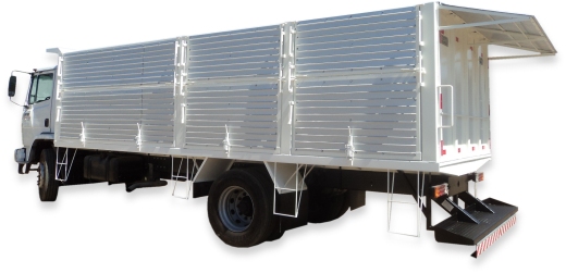 Tampas laterais em perfil “U”, revestimento em chapa galvanizada, com tampas laterais tipo graneleiro, acionamento das travas com alavanca, proteção interna com telas,divisões internas com quadro em perfil “U” e telas, plataforma e capota traseira para transporte de passageiros, assoalho em chapa aço 1020 e formato em ‘V”, dimensões 5.700comp x 2.400larg x 1.800alt (mm), chassi “U” laminado de 6”, instalada no caminhão, pára-choque traseiro e protetores laterais, faixas laterais refletivas de sinalização, escadas laterais.